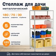 Стеллаж для дачи 2500*1200*600 с 5 полками и цельной стойкой металлический сборный подойдет для дачи, дома, квартиры, гаража, балкона, офиса, склада, архива, магазина, пункта выдач и т.д. Стеллаж обладает высокой прочностью и устойчивостью за счет цельной стойки. Распределенная нагрузка на стеллаж 750 кг. Элементы стеллажа крепятся с помощью болтов. Крепеж входит в комплект, важно учесть, что уголки жесткости крепятся только на верхнюю и нижнюю полки (по 8шт. на каждую полку). Нижнюю полку следует крепить на высоте не выше 20см от пола. Полки имеют усиление в центре, что предотвращает прогиб при излишней нагрузке. Нагрузка на полку 120кг. Стеллаж покрыт полимерной краской серого цвета.