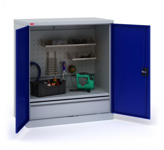 К существующей комплектации можно добавить дополнительные элементы по желанию. Инструментальные шкафы оборудованы замком повышенной секретности и ригельной системой запирания. Полимерное порошковое покрытие корпус светло-серого цвета (RAL 7035) двери синие (RAL 5002).