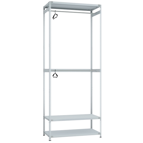 Стеллаж отлично подойдет для хранения одежды, обуви, аксессуаров в гардеробной, на балконе, в офисе, в костюмерной. Так же данными стеллажами могут быть оборудованы раздевалки в школе, детском саду, прачечных, швейные цеха и т.д.