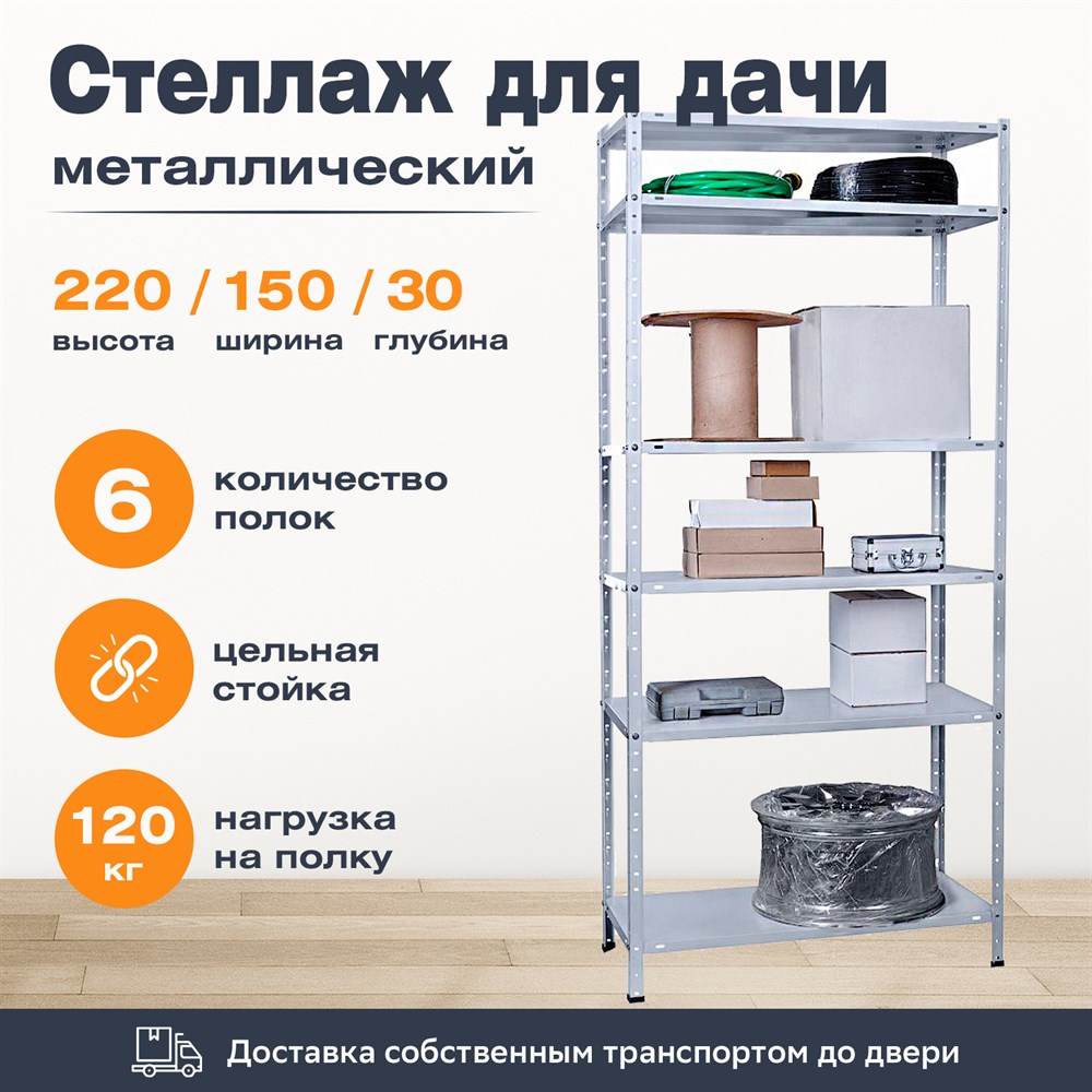 Стеллаж для дачи 2200*1500*300 с 6 полками и цельной стойкой металлический сборный подойдет для дачи, дома, квартиры, гаража, балкона, офиса, склада, архива, магазина, пункта выдач и т.д. Стеллаж обладает высокой прочностью и устойчивостью за счет цельной стойки. Распределенная нагрузка на стеллаж 750 кг. Элементы стеллажа крепятся с помощью болтов. Крепеж входит в комплект, важно учесть, что уголки жесткости крепятся только на верхнюю и нижнюю полки (по 8шт. на каждую полку). Нижнюю полку следует крепить на высоте не выше 20см от пола. Полки имеют усиление в центре, что предотвращает прогиб при излишней нагрузке. Нагрузка на полку 120кг. Стеллаж покрыт полимерной краской серого цвета.