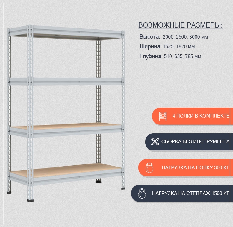 Стеллаж ТИТАН МС-Т MR 2000*1525*635 ( 4 полки) металлический сборный