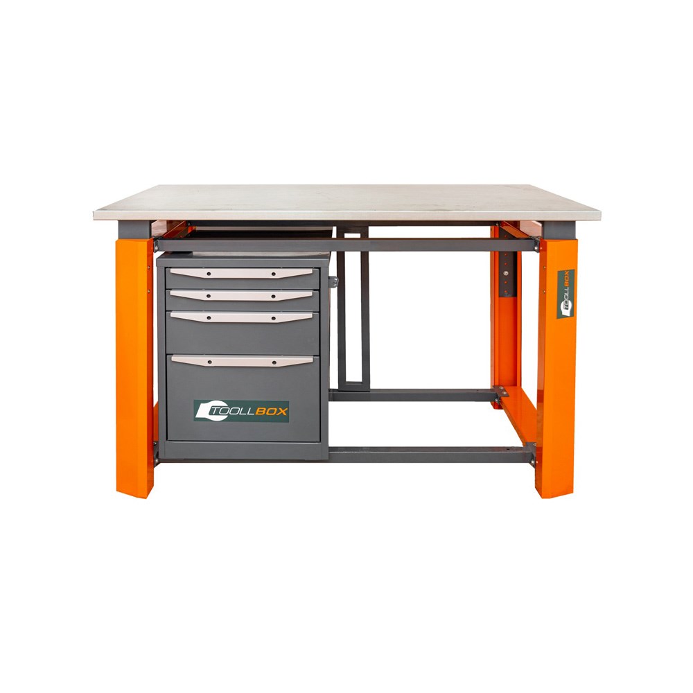 Столешница верстака ТВР1200(ТВ4) изготовлена из фанеры 30мм и закрыта стальным оцинкованным листом 1,2мм. Глубина столешницы 750мм. Предусмотрена регулировка положения столешницы по высоте. Высота регулировки столешницы верстака может регулироваться по желанию заказчика в диапазоне 924-1044 мм.