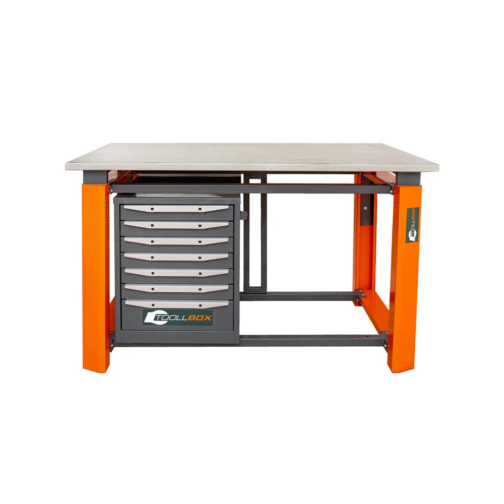 Верстак ТВР1200(ТВ7) cтолешница изготовлена из фанеры 30мм и закрыта стальным оцинкованным листом 1,2мм. Глубина столешницы 750мм. Предусмотрена регулировка положения столешницы по высоте. Высота регулировки столешницы верстака может регулироваться по желанию заказчика в диапазоне 924-1044 мм.