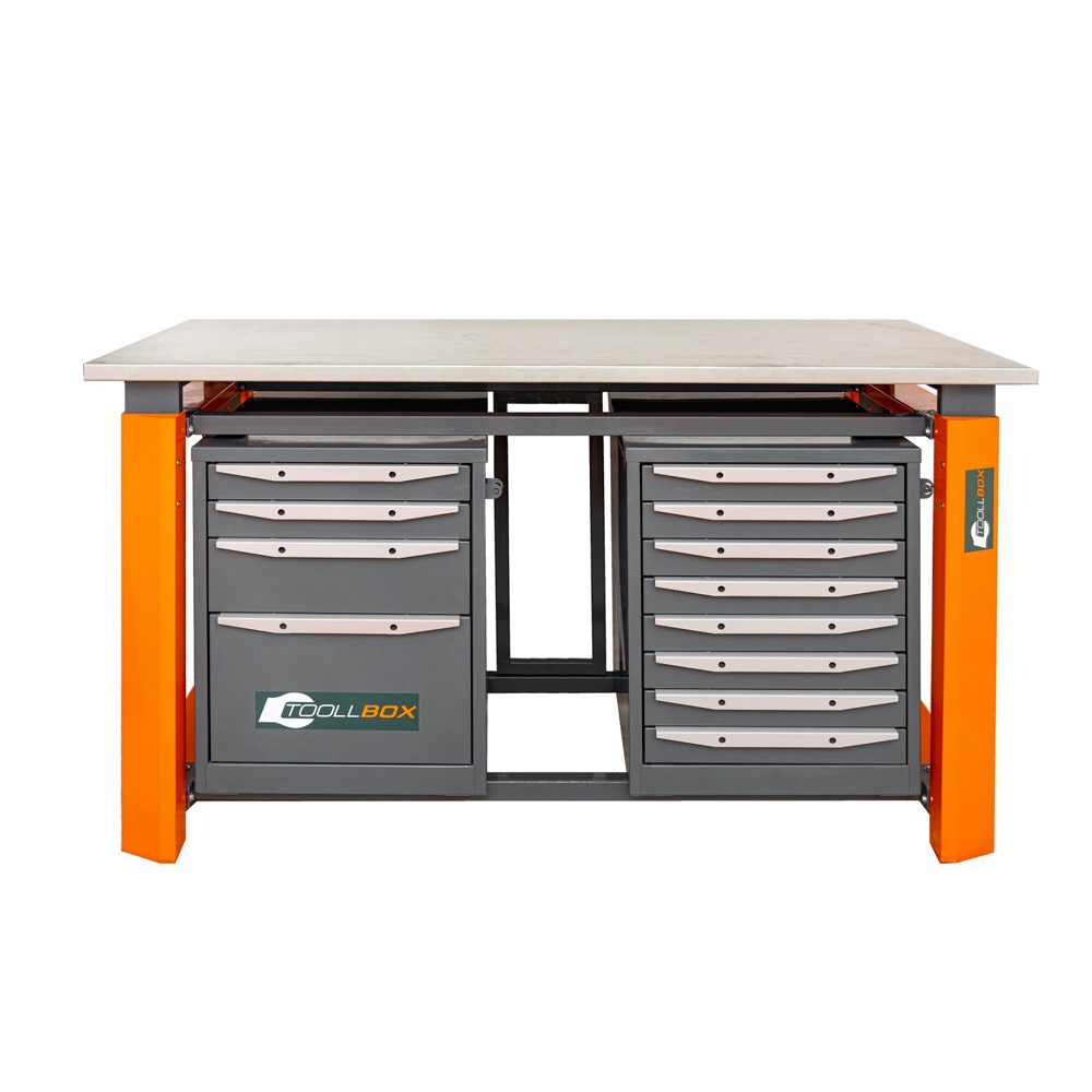 Верстак ТВР1800(ТВ4-ТВ8) двухтумбовый, комбинированный, одна тумба комплектуется 4-мя выдвижными ящиками, имеет петли для запирания на навесной замок, другая тумба комплектуется 8-ю выдвижными ящиками, имеет петли для запирания на навесной замок.